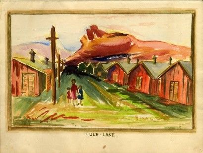 After the bombing at Pearl Harbor in the 1940s, many Japanese Americans were moved to incarceration camps. Below is a piece of art from a 1942 scrapbook painted by a student about life at Tule Lake Incarceration Camp.