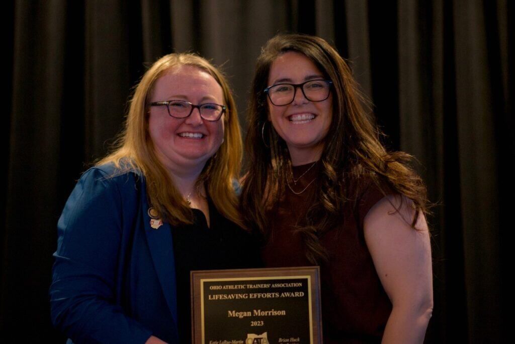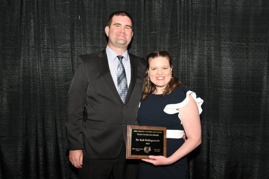 Two employees who support Sports Medicine at Kettering Health have been recognized by the Ohio Athletic Trainers’ Association for their work: Dr. Kali Hollingsworth and Megan Morrison. The two women were honored at the Ohio Athletic Trainers’ Association Annual Hall of Fame Banquet on May 5.