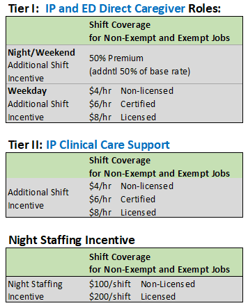 Kettering Health will continue support for our staff picking up extra shifts directly related to inpatient or emergency care for COVID-19 patients. We are continuing to offer two tiers of incentives, with the higher tier targeted for roles providing IP and ED direct patient care. We have restructured the tier incentives.