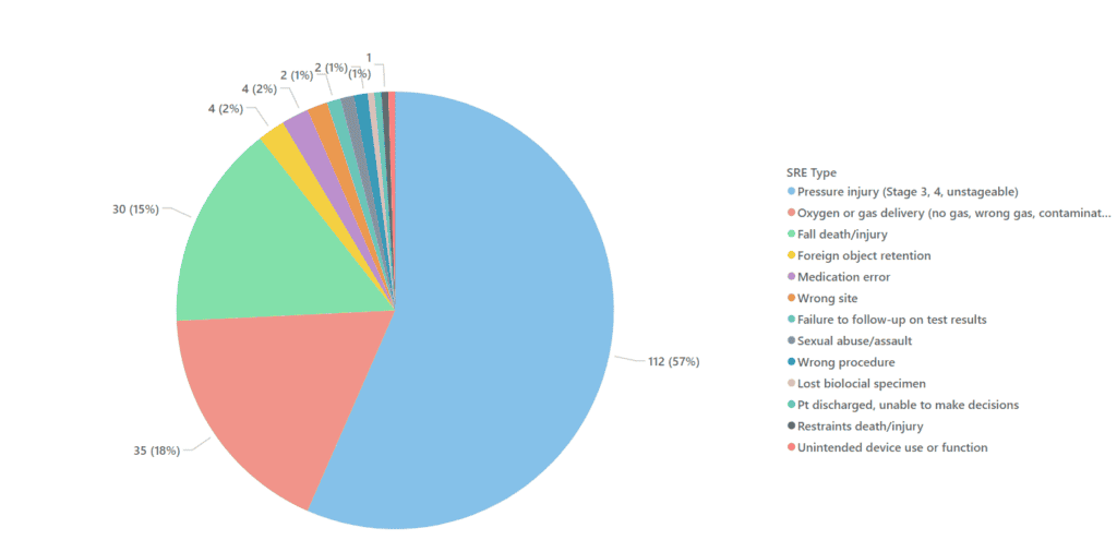The pie chart below shows Kettering Health SRE’s for 2021. The largest area for improvement is reducing falls with injury, oxygen or gas delivery events (O2 events), and hospital-acquired pressure injuries (HAPI). 90% of the SRE’s in 2021 were due to falls with injury (15%), O2 events (18%), or HAPI (57%).