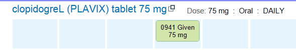 - Let’s review an example: Clopidogrel 75mg po daily at 9 a.m. and dose is administered and documented: