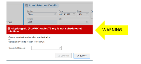 When the end user selects an override reason and continues with the administration, there needs to be a clinical reason and a provider order to administer a medication that was not scheduled to be or was already given.