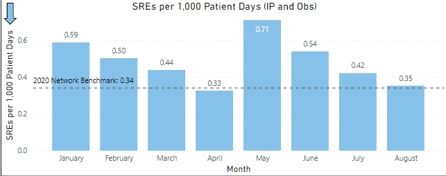A goal of the RCA investigation process is to reduce the number of SREs across Kettering Health. Below is a chart with the rate by month for SREs.
